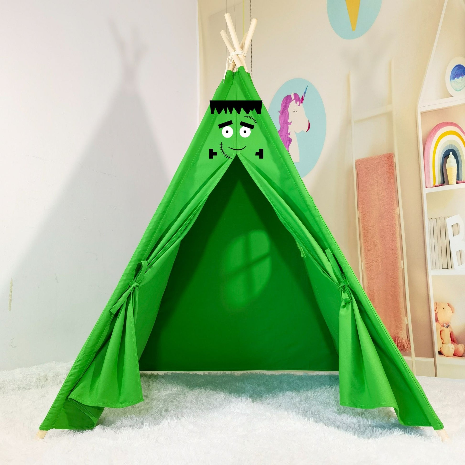 - The green halloween teepee is embellished with a creepy Frankenstein above the door for Halloween lovers.
