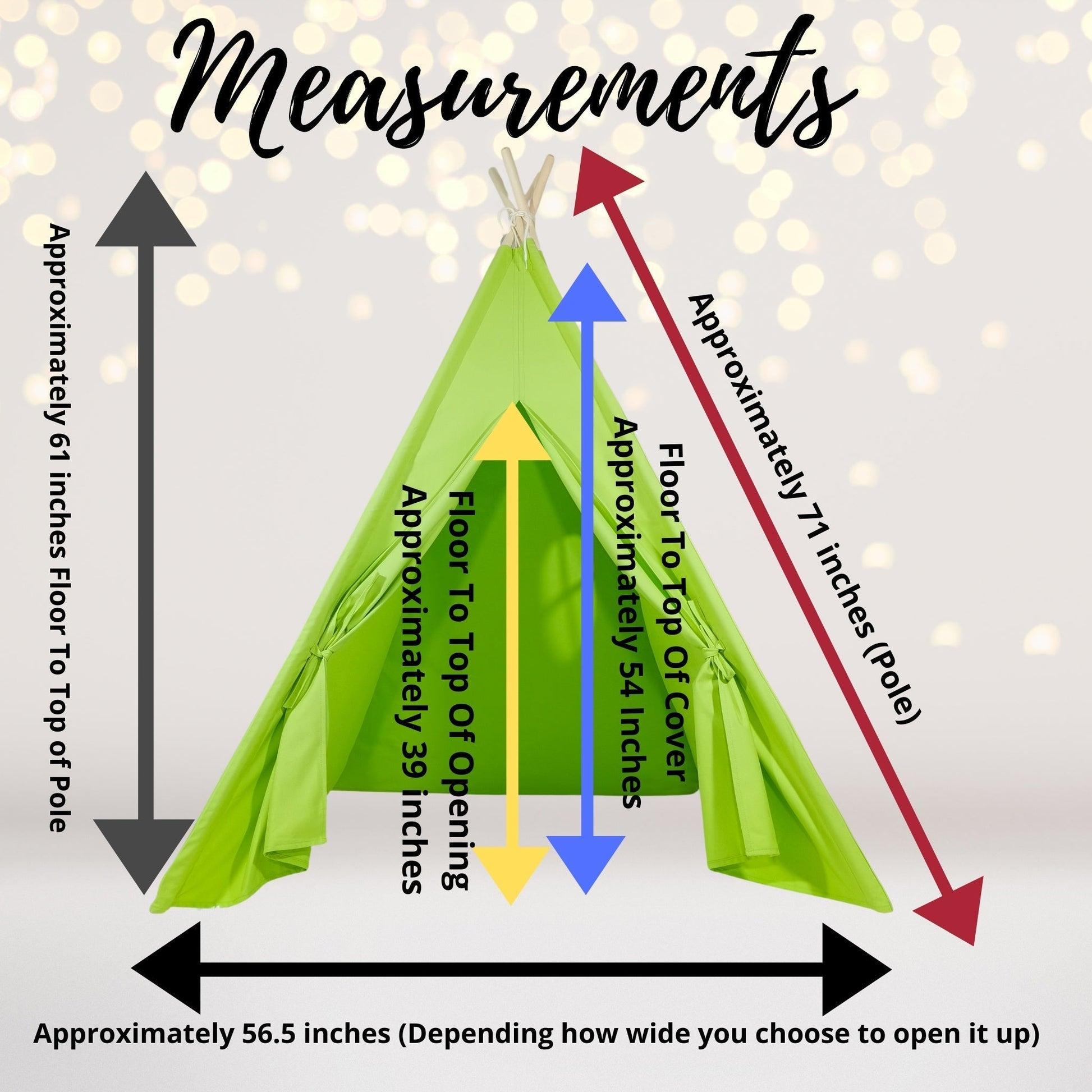 - The dimensions of our bright green halloween play tent teepee are a good size measuring approximately 71x56x61 inches. The width of the play tent door is approximately 56.5 inches. The height of the teepee tents door opening is 39 inches tall. Our kids teepee has enough space for 2 children to play in at one time. Thus allowing your kids all the space they need to invite their plush friends inside for a fun and fabulous tea party.