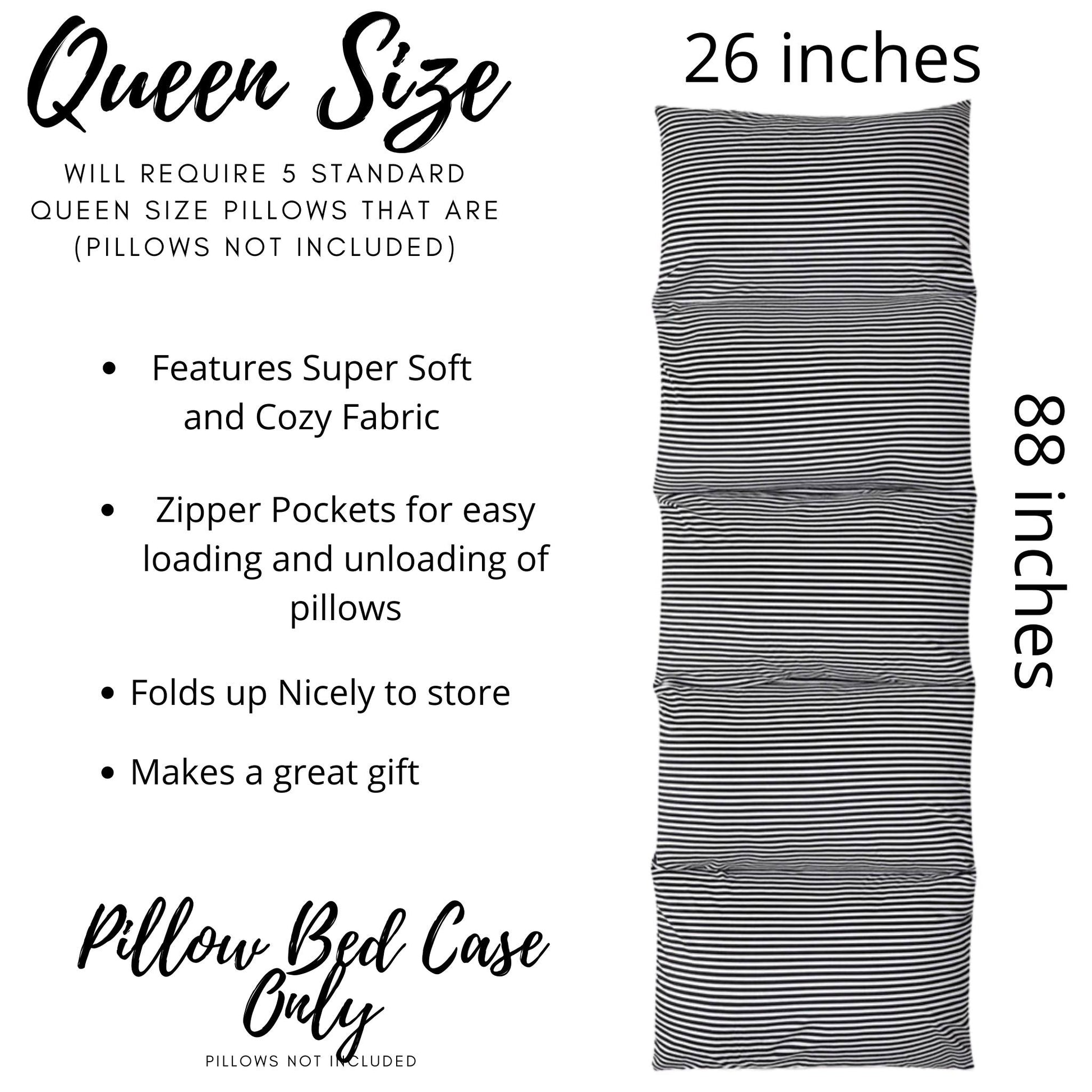 The Black and White Stripe Pillow Bed / Lounger Slipcovers measure 88 inches by 26 inches. They are made of a soft polyester material, and are machine washable on delicate cycle, or may be hand washed. You may tumble dry them on low or they can be laid flat to dry. The Slipcover holds 5 Queen size pillows in the 5 zippered pockets. The Pillows Are Not Included, allowing you to choose the comfort level you prefer.